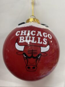 Chicago Bull Team globe ornament, large, with image on two sides. Material : unknown. Dimension: 4.5 inch x 4.5 inch